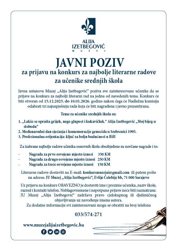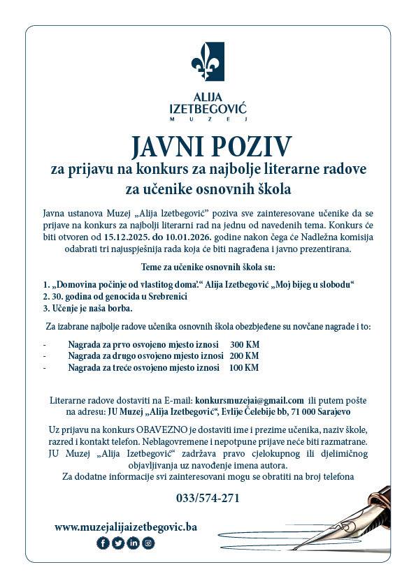 Javna ustanova Muzej „Alija lzetbegović” poziva sve zainteresovane učenike osnovnih i srednjih škola da se prijave na konkurs za najbolji literarni rad na jednu od navedenih tema. Konkurs će biti otvoren od 15.12.2025. do 10.01. 2026. godine nakon čega će Nadležna komisija odabrati po tri najuspješnija rada za učenike osnovnih i srednjih škola, koja će biti nagrađena i javno prezentirana.